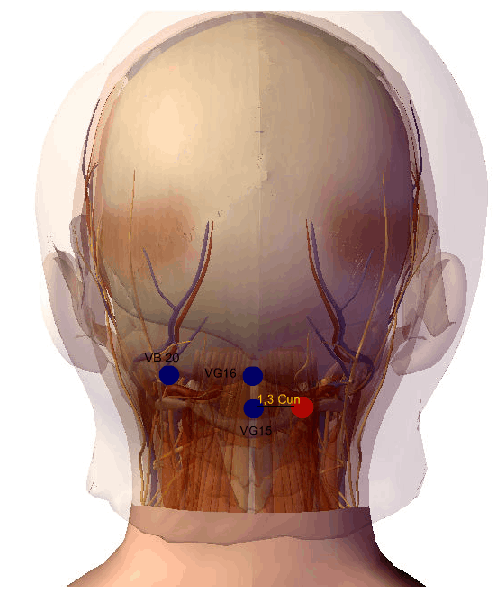 A agulha de Acupuntura atravessa a pele, o tecido celular subcutâneo e a aponeurose epicranial e atinge a lâmina subaponeurótica; relaciona-se com o nervo occipital maior proveniente do ramo dorsal do 2º nervo cervical.