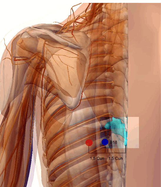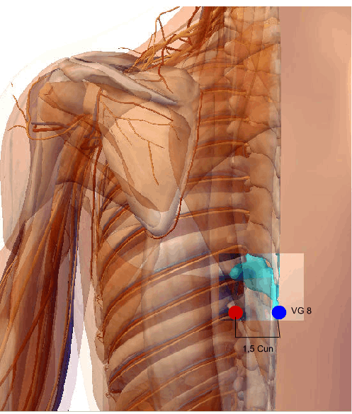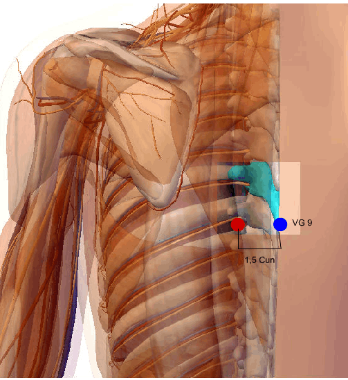 Outro ramo cruza abaixo da axila e sobe pelo tórax para emergir na fossa supraclavicular, ascendendo a seguir, para se ligar em Wangu (VB-12) atrás da orelha, e, finalmente, outro rumo, depois de emergir da fossa supraclavicular, sobe até a maçã do rosto, ao longo do nariz.
