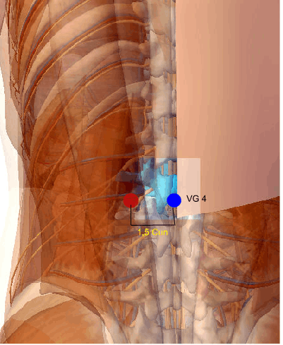 "Nos acometimentos do Canal de Energia Curioso Yang Wei, o doente apresenta subitamente dores e inchaço na região lombar; deve-se estimular o ponto de partida do Yang Wei, ponto B-63 ( Jinmen ) e o ponto de reunião deste Canal Curioso com o Shao Yang do pé ( Vesícula Biliar ), ponto VB-35 ( Yangjiao )". Trata-se de lombalgia Yang Wei. ( Su Wen )