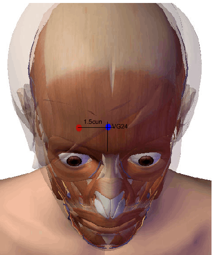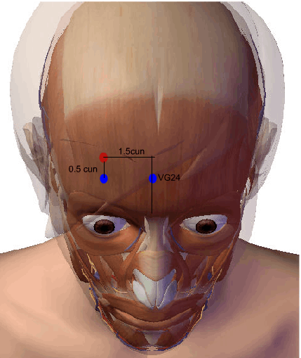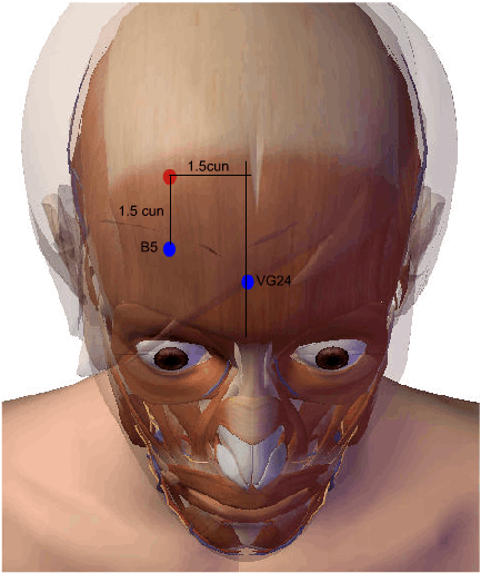 Situa-se na fronte, no couro cabeludo, a um e meio tsun lateral à linha média anterior, na altura do VG-24 ( Shenting ), e a um tsun acima do B-3 ( Neichong ).