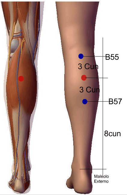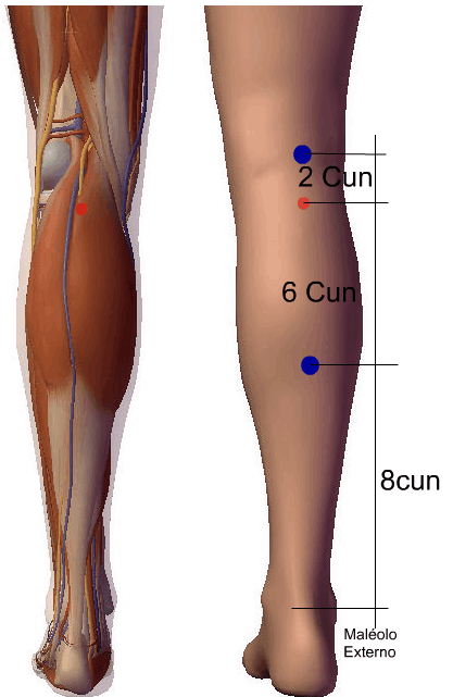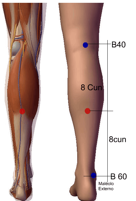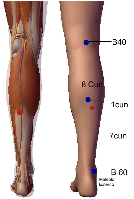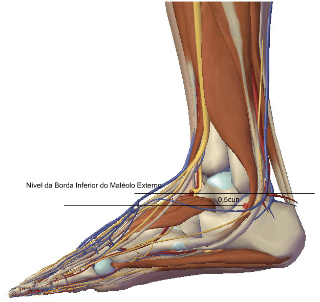 A agulha de Acupuntura atravessa a pele e o tecido celular subcutâneo e atinge a margem superior dos tendões dos músculos fibulares longo e curto; relaciona-se com o nervo cutâneo dorsolateral do pé ( ramo do nervo sural ).