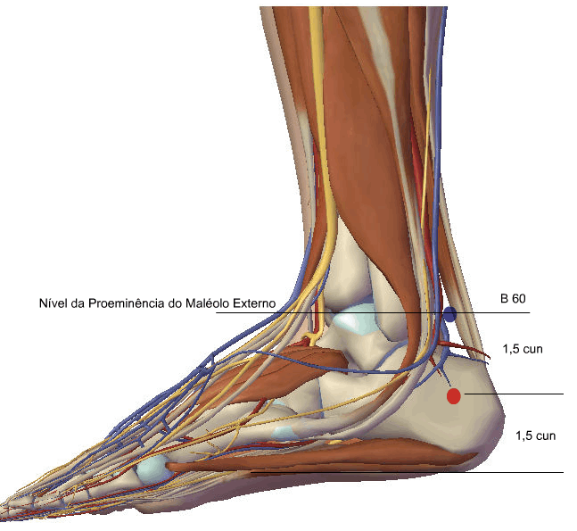 A agulha de Acupuntura atravessa a pele e o tecido celular subcutâneo e penetra o tecido supracalcanear; relaciona-se superficialmente com o nervo cutâneo dorsolateral ( ramo do nervo sural ) e, profundamente, com o nervo calcanear lateral ( ramo do nervo sural ) e com o nervo calcanear medial ( ramo do nervo tibial ).