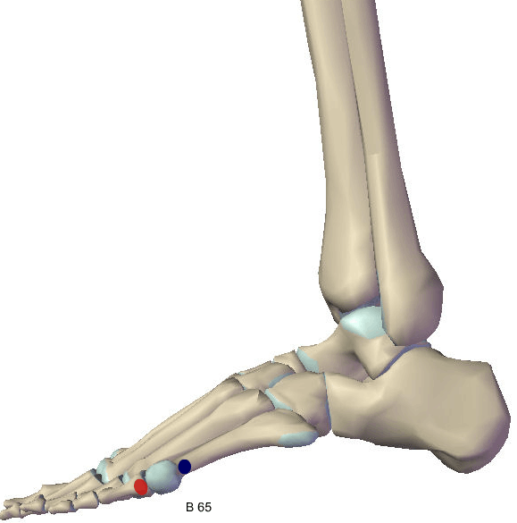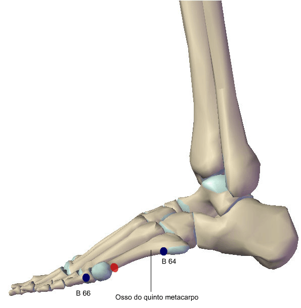 A agulha de Acupuntura atravessa a pele e o tecido celular subcutâneo e penetra a margem superior do músculo abdutor do 5º dedo do pé; relaciona-se superficialmente com o nervo cutâneo dorsolateral e, profundamente, com o nervo plantar lateral do pé ( ramo do nervo tibial ).