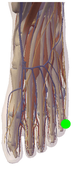 A agulha de Acupuntura atravessa a pele e o tecido celular subcutâneo, atinge a rede arteriolar do dedo mínimo e se relaciona com a rede anastomótica formada pelo nervo cutâneo dorsolateral do pé e ramos dorsais do nervo digital próprio do nervo plantar lateral.