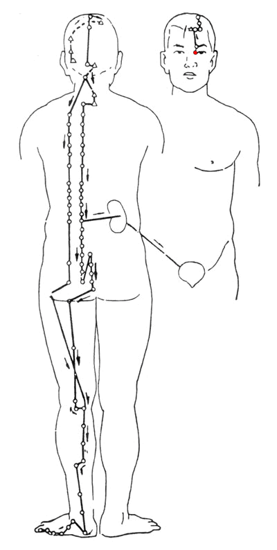O Canal de Energia da Bexiga - Taiyang do Pé começa no canto interno do olho (Jingming, B-1). Ascendendo para a fronte , une-se ao Canal de Energia Du no vértice (Baihui, Du-20) , onde um ramo surge e corre à têmpora.
