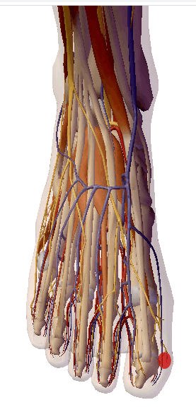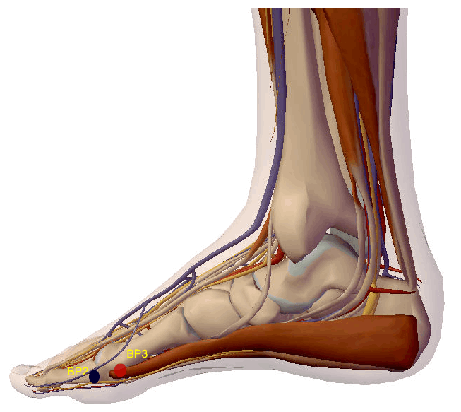 A agulha de Acupuntura atravessa a pele, o tecido celular e a aponeurose e atinge o periósteo; relaciona-se com o nervo digital plantar próprio, proveniente do nervo plantar medial.