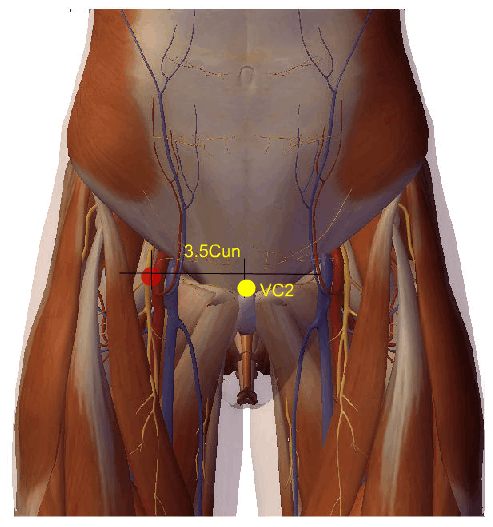 Situa-se na face anterior da articulação coxofemoral, a três e meio tsun lateral à linha média, onde se localiza o ponto de Acupuntura VC-2 ( Qugu ).