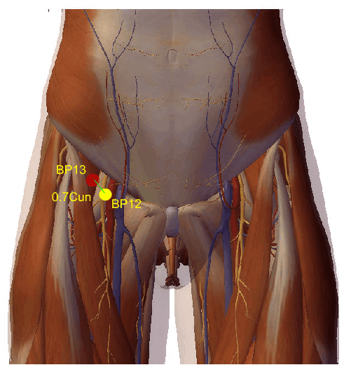 A agulha de Acupuntura atravessa a pele e o tecido celular subcutâneo e penetra o canal inguinal; relaciona-se com o nervo femoral.