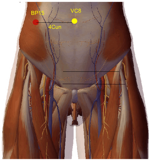 A agulha de Acupuntura atravessa a pele e o tecido celular subcutâneo, penetra os músculos oblíquos externo e interno do abdome e a fáscia transversal e atinge o peritônio parietal; relaciona-se superficialmente com os ramos cutâneos do nervo ílio-hipogástrico e, profundamente, com o nervo ilioinguinal.
