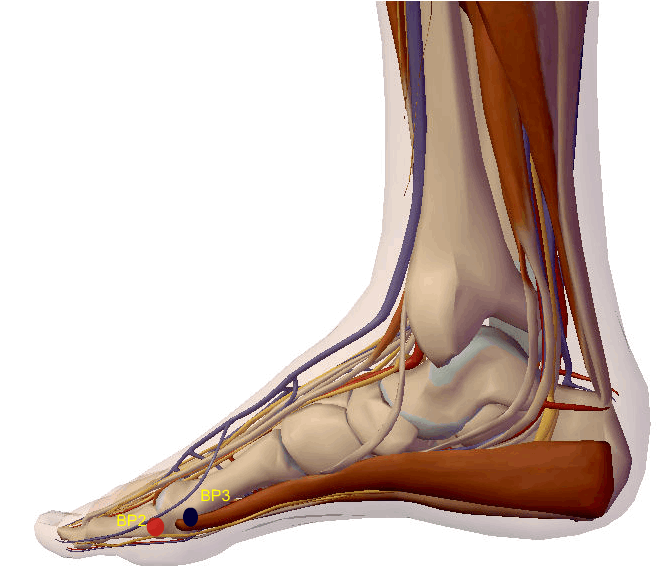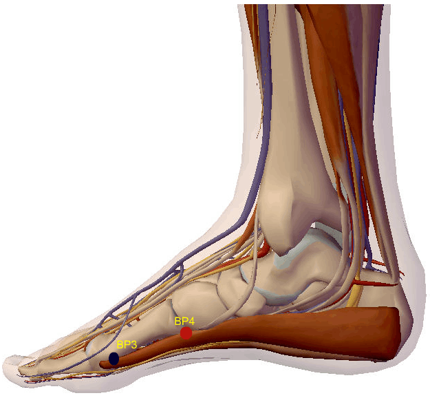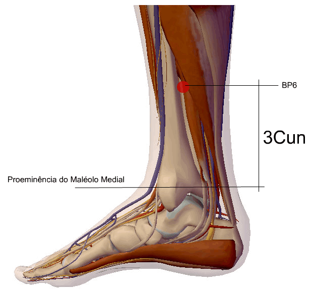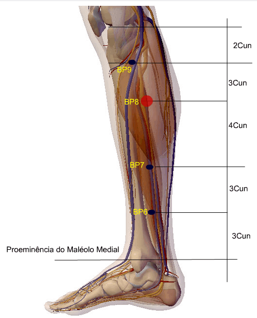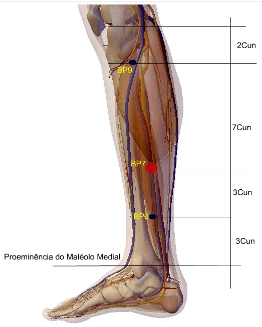 A agulha de Acupuntura atravessa a pele e o tecido celular subcutâneo e penetra o músculo abdutor do hálux, relaciona-se superficialmente com os ramos cutâneos do nervo safeno e, profundamente com o nervo plantar medial.