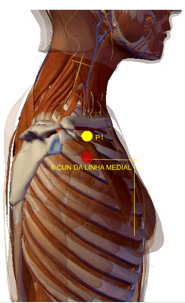 A agulha de Acupuntura atravessa a pele, o tecido celular subcutâneo e o músculo peitoral maior e atinge os músculos intercostais; relaciona-se superficialmente com os ramos cutâneos laterais do 3º nervo intercostal e, profundamente, com o 3º nervo intercostal.