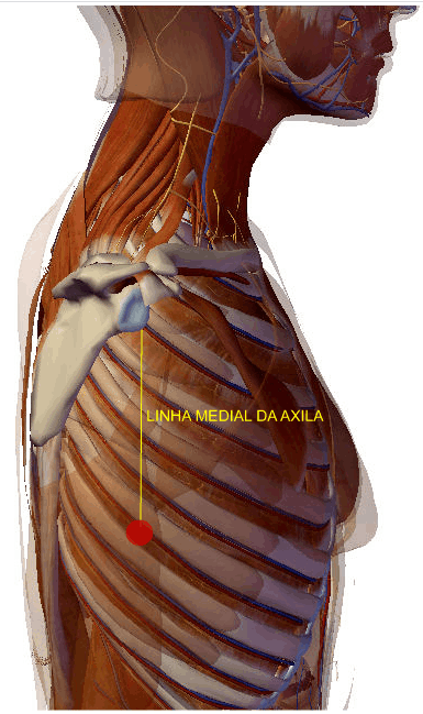 A agulha de Acupuntura atravessa a pele, o tecido celular subcutâneo e o músculo serrátil anterior e atinge os músculos intercostais; relaciona-se superficialmente com os ramos cutâneos laterais do 7º nervo intercostal e, profundamente, com o ramo terminal do nervo torácico longo.