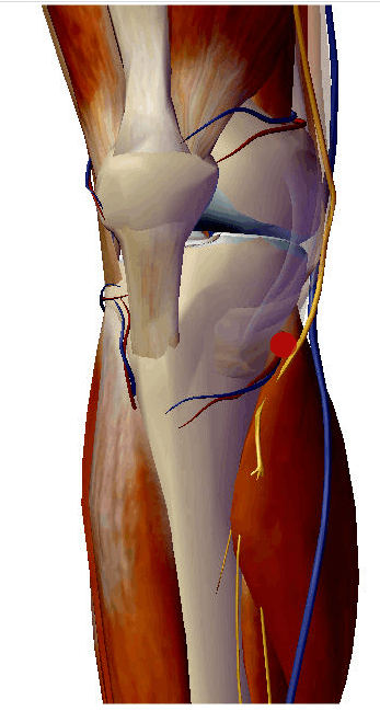A agulha de Acupuntura atravessa a pele e o tecido celular subcutâneo e penetra o músculo vasto medial; relaciona-se superficialmente com os ramos cutâneos anteriores do nervo femoral e, profundamente, com os ramos musculares do nervo femoral.