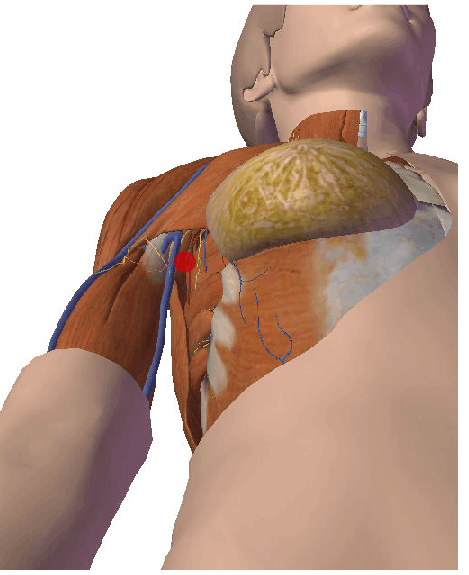 A agulha de Acupuntura atravessa a pele, o tecido celular subcutâneo e a fáscia axilar e atinge o compartimento neurovascular; relaciona-se superficialmente com os ramos cutâneos do nervo cutâneo medial do antebraço e do braço e, profundamente, com os nervos ulnar, mediano e radial.