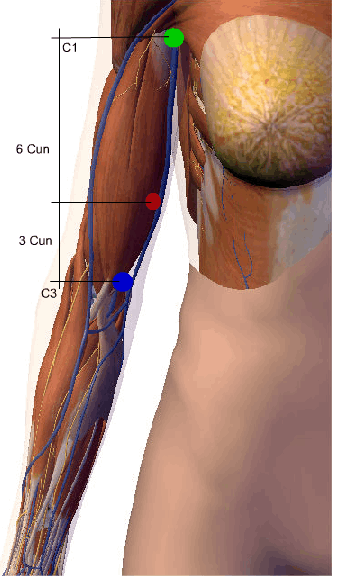 Situa-se a três tsun proximal à prega do cotovelo, no sulco formado pelos músculos bíceps braquial e braquial radial.