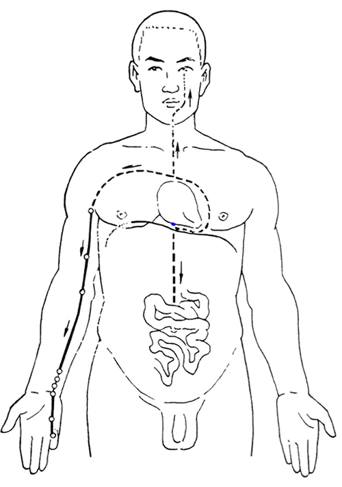 Origina-se no aspecto radial do dedo mínimo da mão e se prende ao osso pisifonne, no pulso. Ascende para se prender primeiramente ao aspecto medial do cotovelo e depois à axila. Entra na axila, cruza com o canal tendinoso do Pulmão e segue medíalmente através da região da mama até o centro do tórax. Desce através do diafragma para terminar no umbigo.