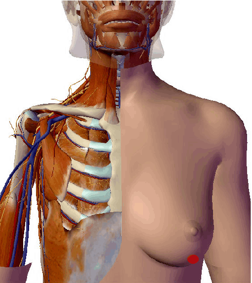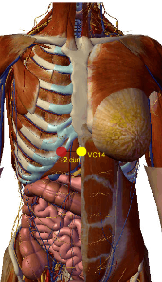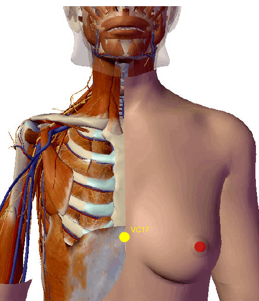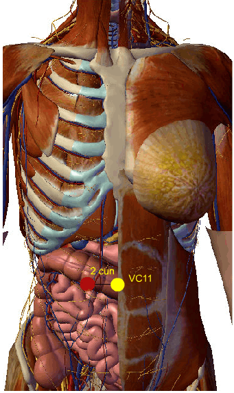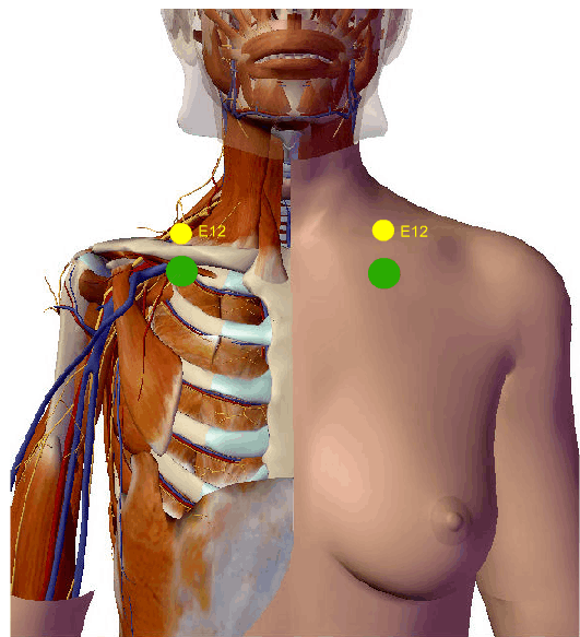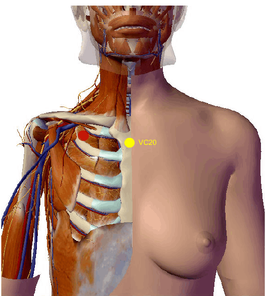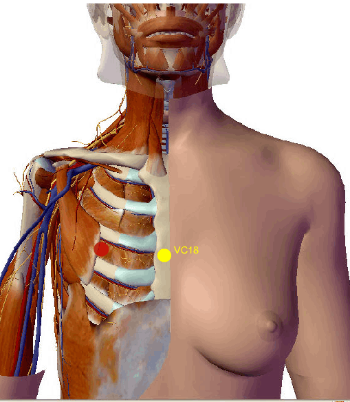 A porção em linha reta do canal de energia surge da fossa supraclavicular e corre para baixo, atravessando o mamilo. Desce pelo umbigo e entra no Qichong (E-30) no lado lateral do abdome inferior.