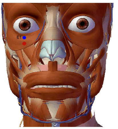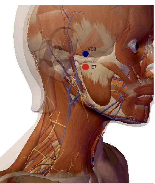 Dor na região zigomática: E-7 ( Xiaguan ), P-5 ( Chize ), E-43 ( Xiangu )