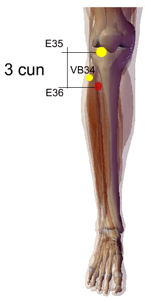 Ponto Iong do C.E.do Estômago correspondente ao Movimento Àgua; por conseguinte, tem o efeito de fazer reduzir o Calor nas afecções, devido à Umidade-Calor.