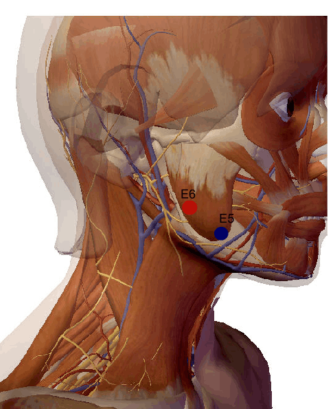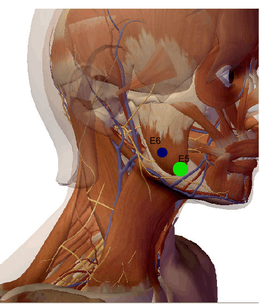 A agulha de Acupuntura atravessa a pele e o tecido celular subcutâneo e atinge o músculo masseter; relaciona-se superficialmente com o ramo marginal da mandíbula e, profundamente, com o nervo massetérico.