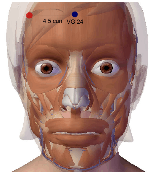 A este nível, o Canal de Energia do Estômago divide-se em dois ramos: um ascendente, que vai até a região parietofrontal, e um descendente, que vai até o pé