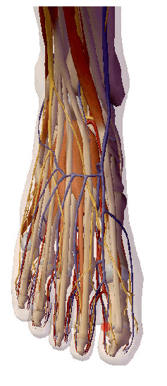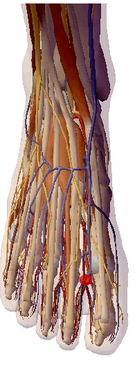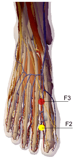 A agulha de Acupuntura atravessa a pele e o tecido celular subcutâneo e atinge o plexo vascular nervoso; relaciona-se com o ramo digital dorsal do nervo fibular profundo e ramos dorsais do nervo digital plantar próprio ( nervo tibial ).