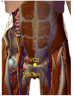 Orquite, edema nos testículos, dor de pênis/vagina: F-1 ( Dadun ), VC-4 ( Guanyuan )