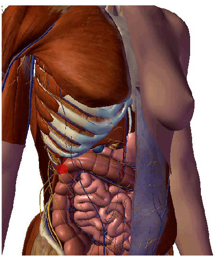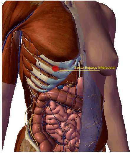 A agulha de Acupuntura atravessa a pele e o tecido celular subcutâneo, penetra o músculo oblíquo externo do abdome e atinge os músculos intercostais; relaciona-se com o 6º nervo intercostal.