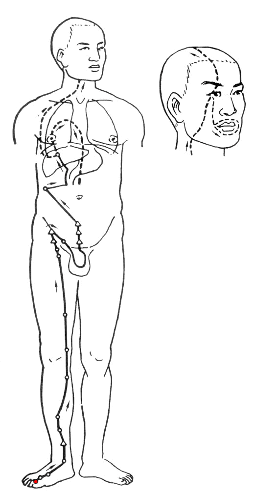 O Canal de Energia do Fígado - Jueyin do Pé começa da região dorsal peluda do hálux (Dadun, F-1) . Estendendo-se para cima junto ao dorso do pé e passando pelo Zhonqfeng (F-4), leun na frente do maléolo medial, ascende a uma área de 8 cun sobre o maléolo medial, por onde se encontra e atrás do Canal de Energia do Baço-Pâncreas - Taiyin do Pé . Então, estende-se mais adiante para cima do lado medial do joelho e ao longo do aspecto mediai da coxa para a região dos pêlos púbicos , onde encurva-se ao redor da genitália externa e sobe ao abdome inferior. Estende-se, então, para cima e encurva-se ao redor do estômago para entrar no fígado, seu órgão pertinente, e se conecta com a vesícula biliar. De lá, continua as