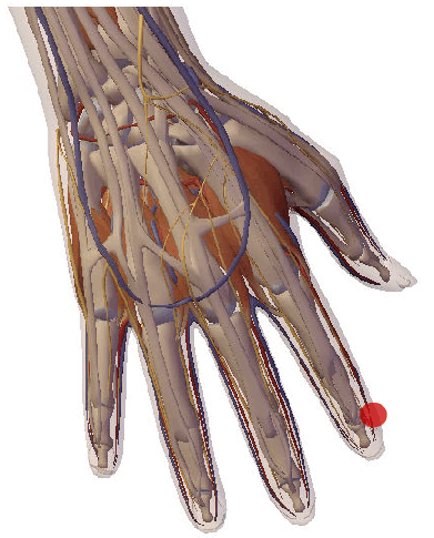 Após atravessar a pele e o tecido celular subcutâneo, a agulha relaciona-se com os ramos do nervo digital dorsal do nervo radial e nervos digitais palmares, próprios do nervo mediano.