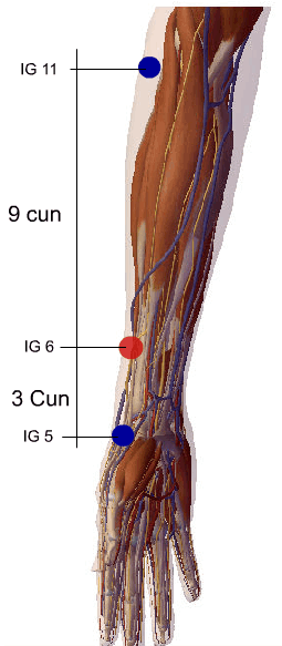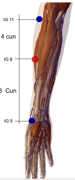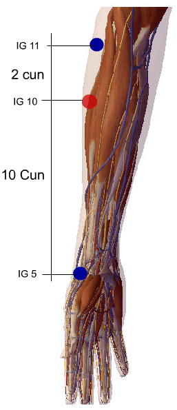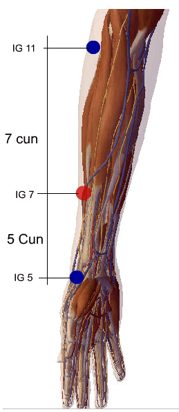 Ponto Iunn, aonde chega a Energia do C.E. Luo Transversal do Pulmão a partir do ponto P7. Ponto para se estimular nos casos de disturbios do QI do C.E. Luo do Int.Grosso.Estimular este ponto nos distúrbios energéticos do C.E.Tendino Muscular do Int.Grosso