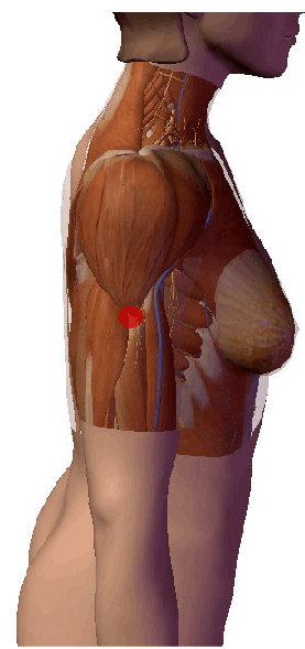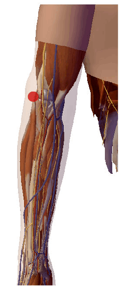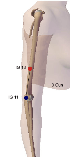 A agulha de acupuntura atravessa a pele e o tecido celular subcutâneo, penetra o músculo deltóide na sua porção inferior e atinge o músculo braquial; superficialmente, relaciona-se com o nervo cutâneo dorsal do braço e, profundamente, com o nervo radial.