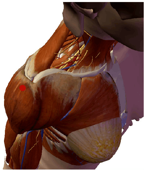 A agulha de Acupuntura, após atravessar a pele e o tecido celular subcutâneo, penetra o músculo deltóide; superficialmente, relaciona-se com os nervos supraclaviculares e, profundamente com os ramos do nervo axilar.