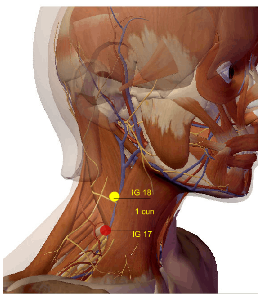 A agulha de Acupuntura atravessa a pele e o tecido celular subcutâneo, penetra o músculo esternocleidomastóideo na sua margem posterior e atinge o músculo elevador da escápula; relaciona-se superficialmente com os ramos subcutâneos do plexo cervical e nervo acessório e, profundamente, com os ramos musculares do plexo cervical.