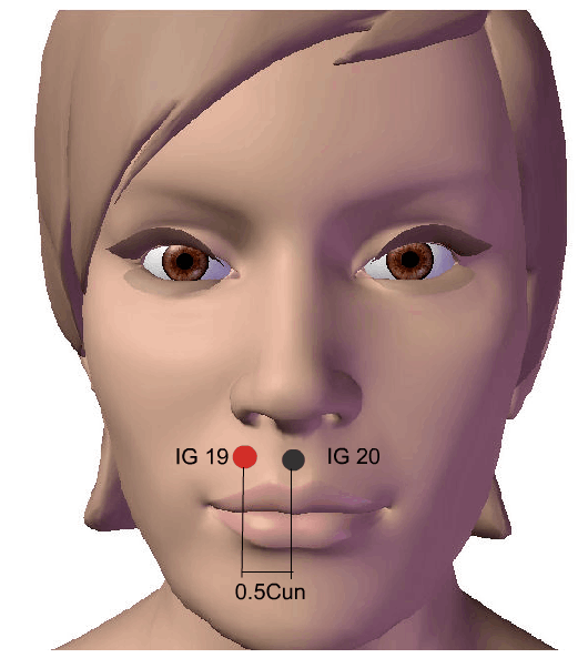 O ponto de Acupuntura do lado direito provém do Canal de Energia do Intestino Grosso do lado esquerdo, sendo que eles se cruzam no ponto VG-26 ( Renzhong )