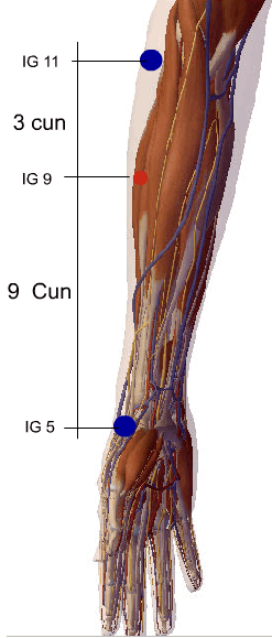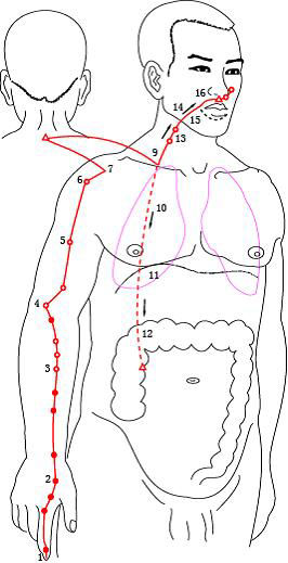 O Canal de Energia do Intestino Grosso - Yangming da Mão começa da ponta do dedo indicador (Shangyang, IG-1). Se estendendo para cima ao longo do lado radial do dedo indi