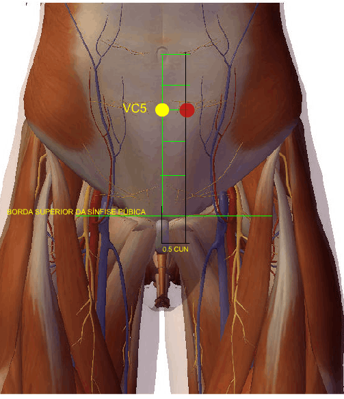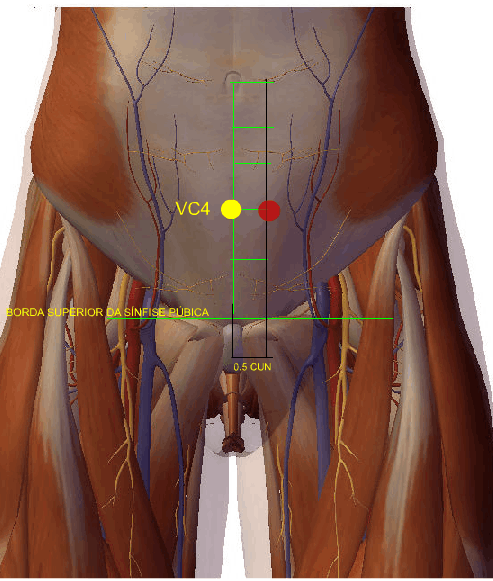 A agulha de Acupuntura atravessa a pele e o tecido celular subcutâneo e penetra pela margem medial do músculo retoabdominal, atravessando a lâmina anterior da bainha deste músculo, e pela fáscia transversal, atingindo a gordura extraperitoneal e o peritônio parietal; relaciona-se superficialmente com os ramos cutâneos do nervo ílio-hipogástrico e, profundamente, com o nervo ílio-hipogástrico.
