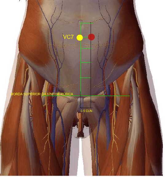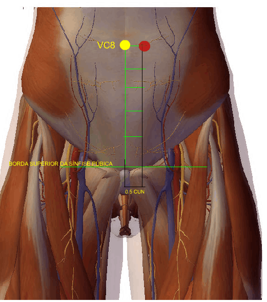 Situa-se um tsun distal à cicatriz umbilical e a meio tsun lateral ao VC-7 ( Yinjiao ).