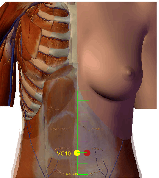 A agulha de Acupuntura atravessa a pele e o tecido celular subcutâneo, penetra pela margem medial do músculo retoabdominal e pela gordura pré-peritoneal e atinge o peritônio parietal; relaciona-se superficialmente com os ramos cutâneos do 10º nervo torácico e, profundamente, com o 10º nervo torácico.
