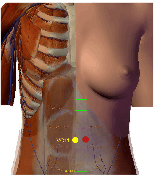 Situa-se no 5º espaço intercostal, a dois tsun lateral à linha média, na horizontal traçada pelo ponto VC-16 ( Zhongting ).
