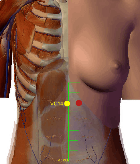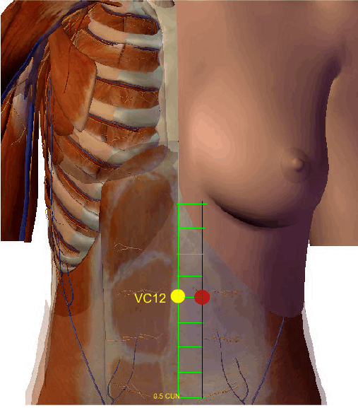 A agulha de Acupuntura atravessa a pele e o tecido celular subcutâneo e penetra pela margem medial do músculo retoabdominal, atravessando a lâmina anterior da bainha deste músculo, e pela fáscia transversal, atingindo a gordura extraperitoneal e o peritônio parietal; relaciona-se superficialmente com os ramos cutâneos do nervo subcostal e, profundamente, com o nervo subcostal.