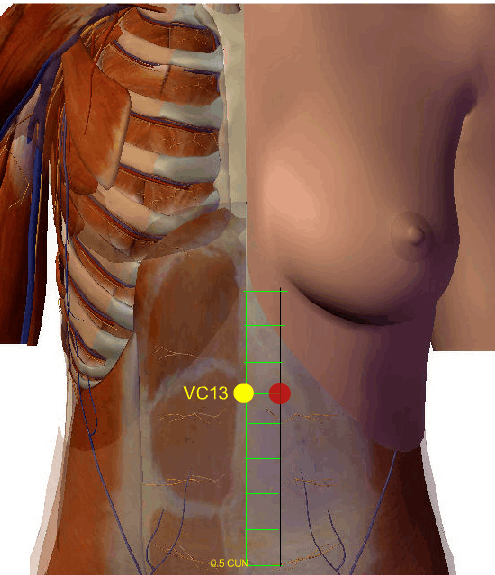 Situa-se meio tsun distal ao VC-12 ( Zhongwan ) e a quatro tsun proximal ao ponto R-16 ( Huangshu ).