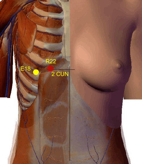 A agulha de Acupuntura atravessa a pele e o tecido celular subcutâneo, penetra pela margem inferior do músculo peitoral maior e o músculo oblíquo externo do abdome e atinge os músculos intercostais; relaciona-se superficialmente com os ramos cutâneos anteriores do 5º nervo intercostal e, profundamente, com o 5º nervo intercostal.