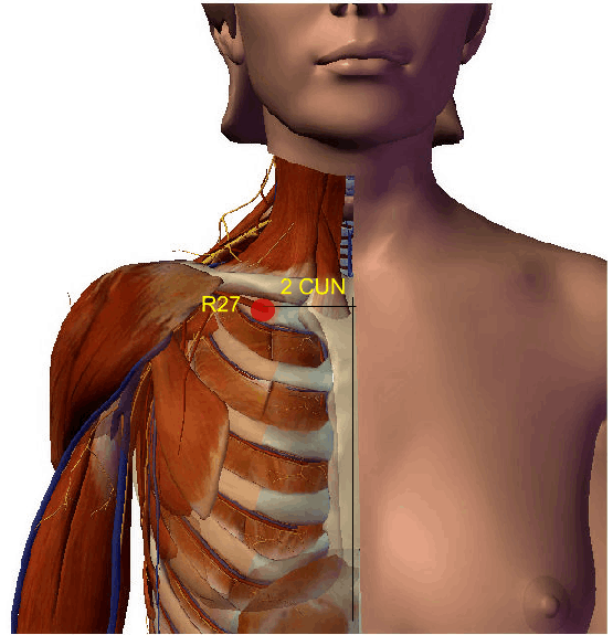 A agulha de Acupuntura atravessa a pele, o tecido celular subcutâneo e o músculo peitoral maior e atinge os músculos intercostais; relaciona-se superficialmente com os ramos cutâneos do nervo supraclavicular medial e, profundamente, com o nervo supraclavicular medial ( ramo do plexo cervical ).