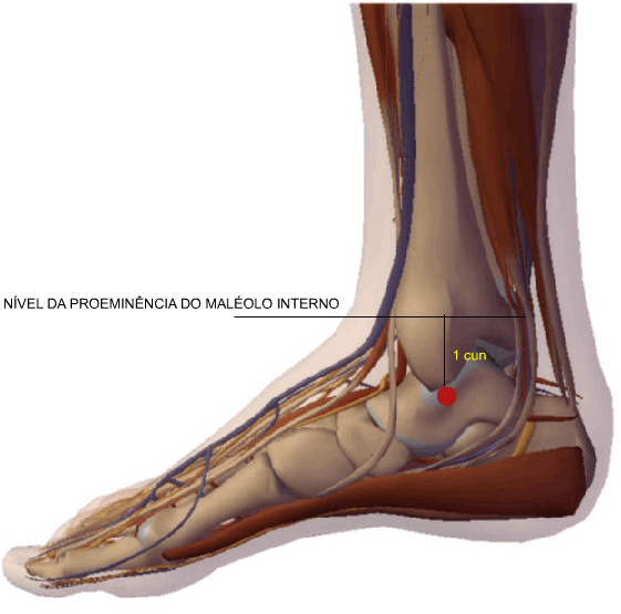 A agulha de Acupuntura atravessa a pele e o tecido celular subcutâneo e penetra o músculo abdutor do hálux e a cabeça medial do músculo flexor curto do hálux; relaciona-se superficialmente com o ramo cutâneo medial do nervo safeno ( ramo do nervo femoral ) e, profundamente, com o nervo plantar medial ( ramo do nervo tibial posterior ).