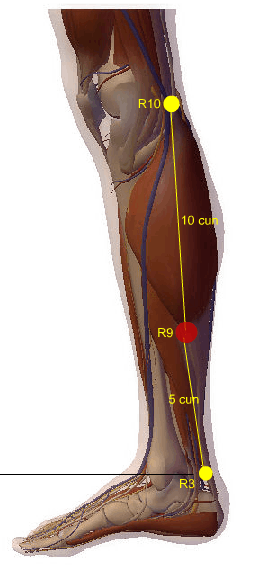 O Canal de Energia do Rim - Shaoyin do Pé começa do aspecto inferior do dedo mínimo do pé e corre obliquamente para a sola do pé (Yongquan, R-1). Emergindo do aspecto inferior da tuberosidade do osso navicular e correndo atrás do maléolo medial, entra no calcanhar. Então, ascende ao longo do lado medial da perna para o lado medial da fossa poplítea e estende-se, mais adiante, para cima ao longo do aspecto posteromedial da coxa para a coluna vertebral (Changqiang, Du-1), onde entra no rim, seu órgão pertinente, e se conecta com a bexiga.